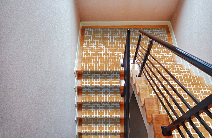 Svängda trappor sys in för hand och läggs alltid så att mattan kan flyttas i framtiden för eventuella slitageskador.